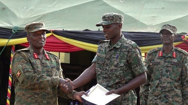 Maj Gen Paul Muhanguzi handing over a certificate to one of the Non Commissioned Officers