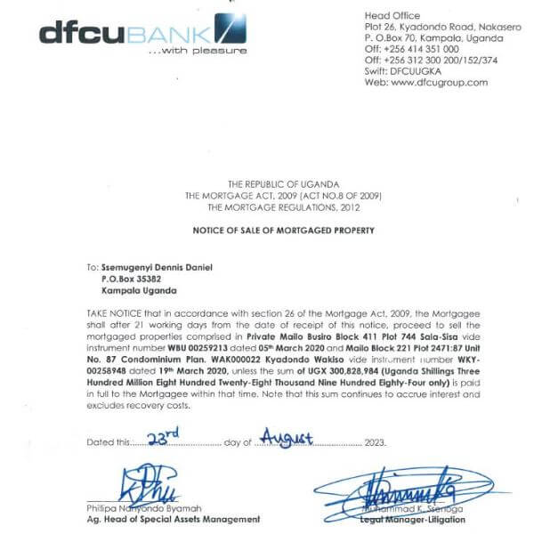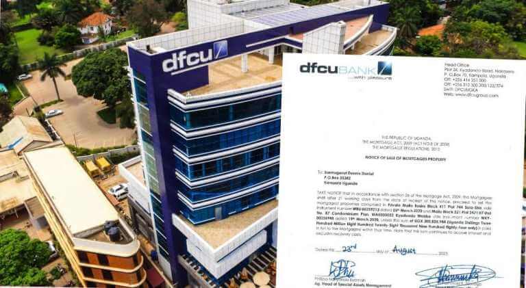 On August 28, 2023, DFCU threatened through a notice to sell his mortgaged property to recover more sh300.8mln from him.