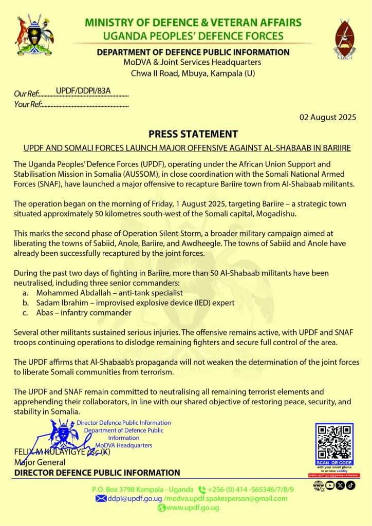 According to the UPDF Spokesman Maj Gen Felix Kulayigye said that the operation began on the morning of Friday, 1st August 2025, targeting Bariire which is a strategic town situated approximately 50 kilometres south-west of the Somali capital, Mogadishu.