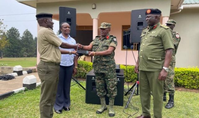 Maj Gen Deus Sande receiving the Public Address Equipment from Wazalendo Sacco